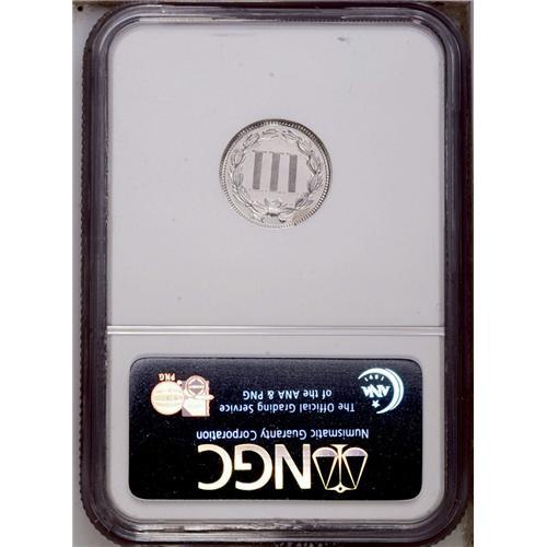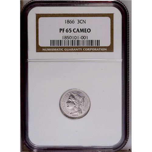 <B>1866<3CN> PR65 Cameo NGC.</B></I> Fully struck with a slight glittery haze in the fields. The adequately frosted devices present a pleasing, mild cameo effect against the glassy, watery backdrop provided by the highly reflective fields. <BR><BR><B>Important notice:</B> Heritage usually auctions material at the rate of 200-250 lots per hour. On some occasions eBay Live bid software or the Internet may not be able to keep up with the pace of the auction. We recommend placing a realistic absentee bid now as insurance to avoid disappointment. Occasionally the auctioneer may eliminate or reject an eBay Live bid, and the auctioneer may also reopen a lot after the close of the eBay live bidding (usually because we missed an audience bid), and may reject your bid even if it shows you as the winning bidder. By bidding via eBay Live, you agree that Heritage may award the lot to another bidder at its sole discretion under the circumstances described above or any other reasonable circumstances. Since eBay bids are not shown to us until we open the lot on the floor, we treat those bids just like floor bids. In most cases the floor responds before the eBay bid is presented to us, due to Internet lag time, so for consistency we have made it a policy that floor bids are always considered first over tie eBay live bids. Also please note that all Heritage lots purchased through eBay Live carry a 20% Buyer's Premium. Please make sure you read the Terms and Conditions before you bid. This lot is being auctioned in conjunction with a live floor auction by Heritage Galleries & Auctioneers. All final auction and invoice information will be supplied by Heritage Galleries & Auctioneers, and all other information should be considered preliminary. Lot:793 <BR><BR><B>Winning Notification and Billing:</B> After the FINAL session in this auction is complete, Heritage will send e-mail and snail mail invoices. This process normally takes several days. All final auction and invoice information will be supplied by Heritage Galleries & Auctioneers, and all other information should be considered preliminary. <BR><BR>This auction will be conducted on a live auction floor and over the Internet through eBay Live. If you choose to place an absentee bid, please take a moment to <font color='#0000ff'><u><a href='http://pages.ebay.com/liveauctions/help/before/laabsentee.html'>learn how eBay Live absentee bidding works</a></u></font><font color='#000000'>