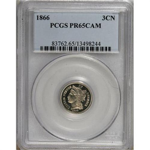 <B>1866 3CN PR65 Cameo PCGS.</B></I> The obverse is essentially untoned, while the reverse has a thin curtain of dappled cloud-gray haze within the wreath. Deeply reflective and carefully preserved with rich frost on the boldly impressed devices and undeniable contrast. Population: 17 in 65 Cameo, 12 finer (7/07).<BR><BR><b>Shipping:</b> Coins & Currency (<a target="_blank" href="http://www.heritageauctions.com/common/shipping.php">view shipping information</a>)
