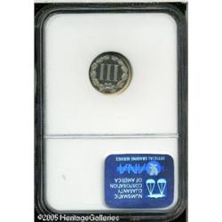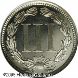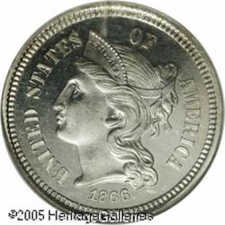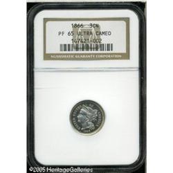 <B>1866 3CN PR65 Deep Cameo NGC.</B></I> Particularly well frosted for this second year proof, and only a couple of insignificant spots on the portrait from Superb status. Definitely scarce as such. Population: 1 in 65 Deep Cameo, 6 finer (1/05).<BR><I>From The Mike Jacobson Collection.</B></I> Lot:5719
