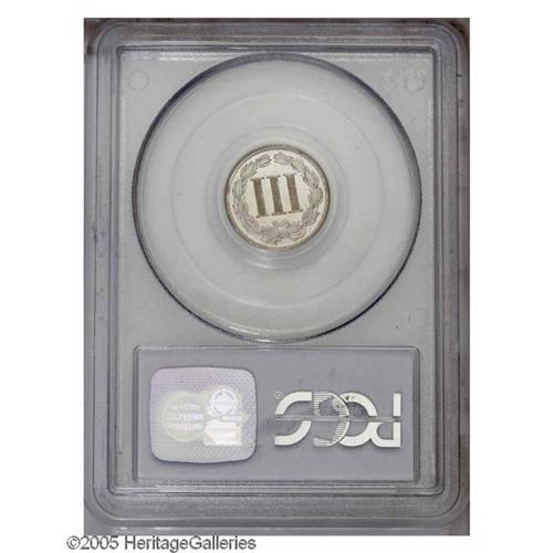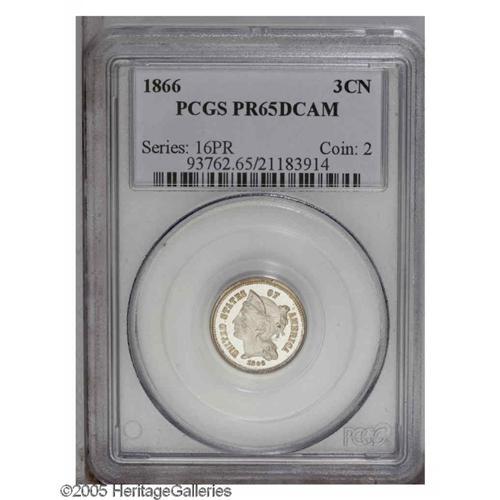 <B>1866<3CN> PR65 Deep Cameo PCGS.</B></I> Although not as rare as the first-year 1865, the proof 1866 Three Cent Nickel is still a challenging coin to locate as a Gem and with appreciable contrast. There is a little light russet iridescence toward the denticles and over the rims, but both sides basically present as brilliant. The cameo contrast is bold, and there are no distracting blemishes. Population: 4 in 65 Deep Cameo, 7 finer (10/05).