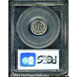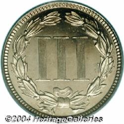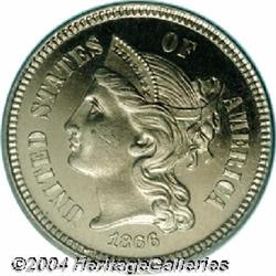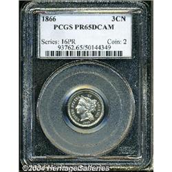 <B>1866<3CN> PR65 Deep Cameo PCGS.</B></I> Although not as rare as the first-year 1865, the proof 1866 Three Cent Nickel is still a challenging coin to locate as a Gem. Both sides basically present as brilliant with only the slightest hint of patina. The cameo contrast is bold, and there is only a single mentionable anomaly on Liberty's cheek. Population: 4 in 65 Deep Cameo, with a mere 6 finer (9/04). <BR><BR><B>Important notice:</B> Heritage usually auctions material at the rate of 200-250 lots per hour. On some occasions eBay Live bid software or the Internet may not be able to keep up with the pace of the auction. We recommend placing a realistic absentee bid now as insurance to avoid disappointment. Occasionally the auctioneer may eliminate or reject an eBay Live bid, and the auctioneer may also reopen a lot after the close of the eBay live bidding (usually because we missed an audience bid), and may reject your bid even if it shows you as the winning bidder. By bidding via eBay Live, you agree that Heritage may award the lot to another bidder at its sole discretion under the circumstances described above or any other reasonable circumstances. Since eBay bids are not shown to us until we open the lot on the floor, we treat those bids just like floor bids. In most cases the floor responds before the eBay bid is presented to us, due to Internet lag time, so for consistency we have made it a policy that floor bids are always considered first over tie eBay live bids. Also please note that all Heritage lots purchased through eBay Live carry a 20% Buyer's Premium. Please make sure you read the Terms and Conditions before you bid.