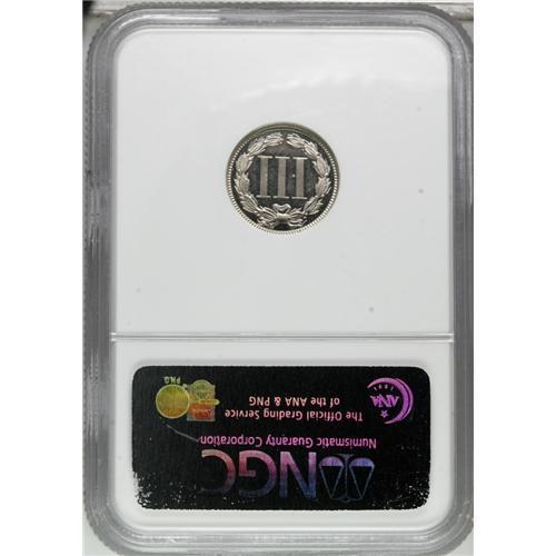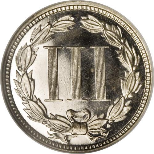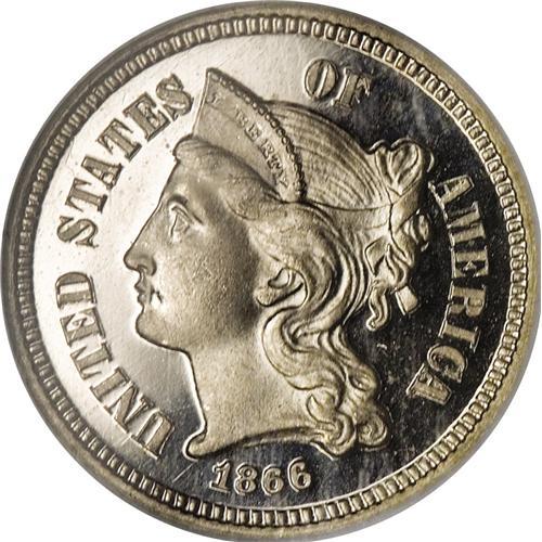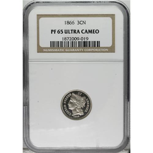 <B>1866 3CN PR65 Ultra Cameo NGC.</B></I> Of the 725 proofs originally produced, fewer than half are known to survive at all grade levels. Of those, only a small percentage have been certified as either Deep Cameo (at PCGS) or Ultra Cameo (at NGC). This remarkable Gem is sharply struck and well preserved, with majestically deep reflectivity in the inky-black fields, and substantial frosting on the gray-silver devices.<BR><BR><b>Shipping:</b> Coins & Currency (<a target="_blank" href="http://www.heritageauctions.com/common/shipping.php">view shipping information</a>)
