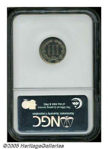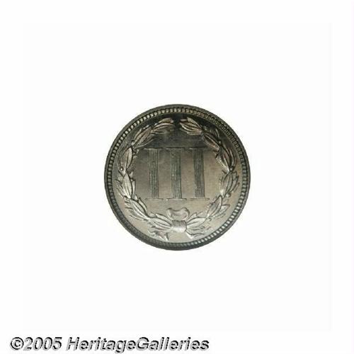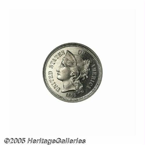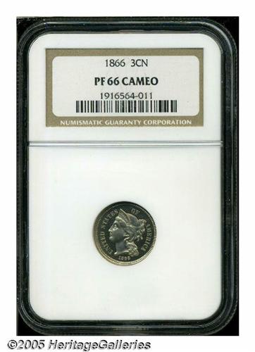 <B>1866<3CN> PR66 Cameo NGC.</B></I> Faint gold toning over the surfaces and well contrasted by the reflective fields. The surfaces show a bit of hazy toning which is visible when the coin is examined under a light. Population: 6 in 66 Cameo, 1 finer (6/05).