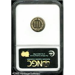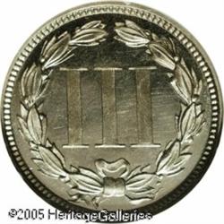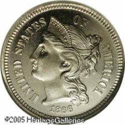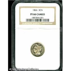 <B>1866 3CN PR66 Cameo NGC.</B></I> Sharp and frosty, the devices appear to float atop the smooth, glassy reflectivity in the fields. There are no outwardly distracting hairlines, but a small lintmark is noted from Liberty's lower haircurl to the rim. Population: 6 in 66 Cameo, 1 finer (1/05). Lot:5777