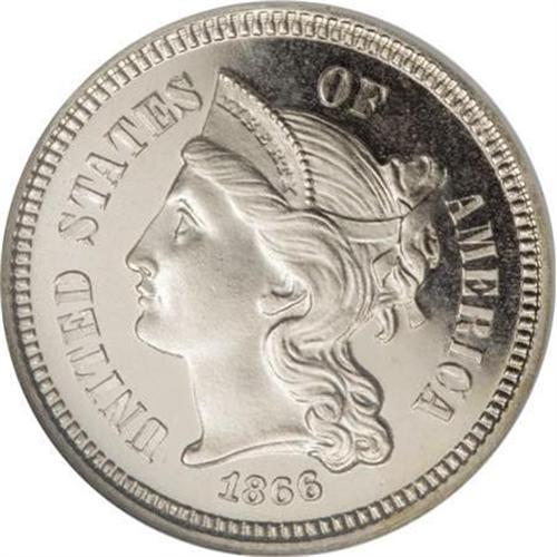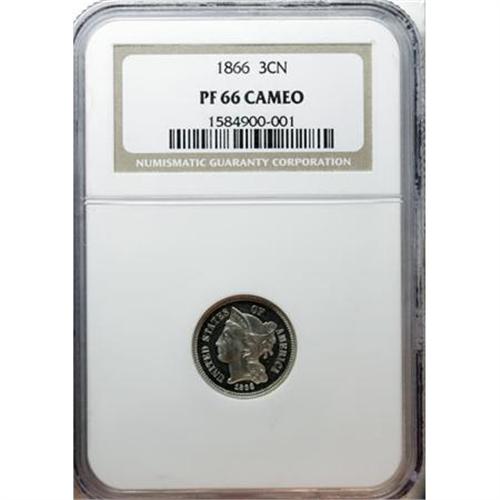 <B>1866 3CN PR66 Cameo NGC.</B></I> Speckles of milky color appear under magnification on this three cent nickel Premium Gem Cameo proof. The design elements are exquisitely struck, including complete delineation in the lines of the III denomination. A minute reverse mark or two does not disturb. Census: 11 in 66 Cameo, 1 finer (12/07).<BR><BR><b>Shipping:</b> Coins & Currency (<a target="_blank" href="http://www.heritageauctions.com/common/shipping.php">view shipping information</a>)