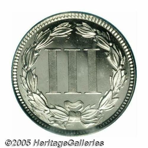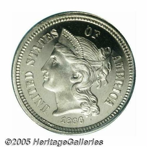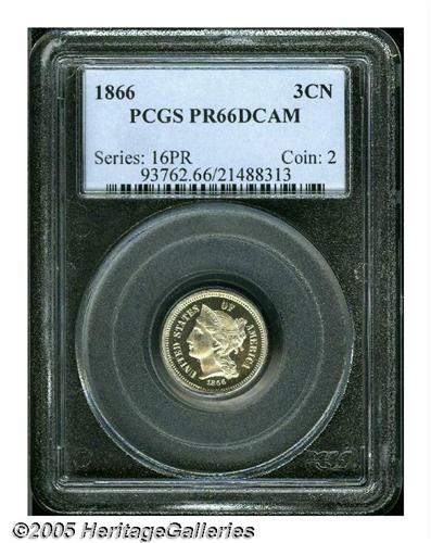 <B>1866<3CN> PR66 Deep Cameo PCGS.</B></I> A splendid ice-white specimen with particularly impressive contrast on the obverse. Noteworthy condition for this second-year proof issue. Population: 6 in 66, 0 finer (4/05).<BR><I>From The Western Hills Collection.</B></I>