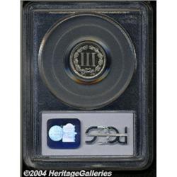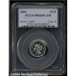 <B>1866<3CN> PR66 Deep Cameo PCGS.</B></I> A splendid ice-white specimen with particularly impressive contrast on the obverse. Noteworthy condition for this second-year proof issue. Population: 4 in 66 Deep Cameo, 0 finer (3/04). <BR><BR><B>Important notice:</B> Heritage usually auctions material at the rate of 200-250 lots per hour. On some occasions eBay Live bid software or the Internet may not be able to keep up with the pace of the auction. We recommend placing a realistic absentee bid now as insurance to avoid disappointment. Occasionally the auctioneer may eliminate or reject an eBay Live bid, and the auctioneer may also reopen a lot after the close of the eBay live bidding (usually because we missed an audience bid), and may reject your bid even if it shows you as the winning bidder. By bidding via eBay Live, you agree that Heritage may award the lot to another bidder at its sole discretion under the circumstances described above or any other reasonable circumstances. Since eBay bids are not shown to us until we open the lot on the floor, we treat those bids just like floor bids. In most cases the floor responds before the eBay bid is presented to us, due to Internet lag time, so for consistency we have made it a policy that floor bids are always considered first over tie eBay live bids. Also please note that all Heritage lots purchased through eBay Live carry a 20% Buyer's Premium. Please make sure you read the Terms and Conditions before you bid.