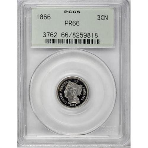 <B>1866 3CN PR66 PCGS.</B></I> There is no doubt that the buyer of this coin will be sending it back to PCGS for a Cameo or Deep Cameo designation. It currently resides in a green-label PCGS holder, certified prior to the introduction of such designations. It is a glittering Premium Gem with intense contrast between the brilliant devices and deeply mirrored fields. Aside from a faint splash of toning, both sides have full mint brilliance.<BR><BR><B>Coin Engraver:</B> James B. Longacre<BR><BR><b>Shipping:</b> Coins & Currency (<a target="_blank" href="http://www.heritageauctions.com/common/shipping.php">view shipping information</a>)
