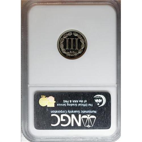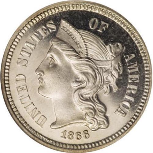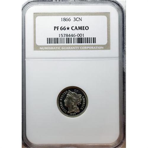 <B>1866 3CN PR66 </B></I><img src="/images/star.gif" width="10" height="10" alt="" border="0"><B> Cameo NGC.</B></I> Much cameo contrast appears on the surfaces of this well-produced coin. Just a hint of gold-champagne patina is noted, along with a remarkable absence of contact or other distractions. This charming piece is tied with one other PR66 <img src="/images/star.gif" width="10" height="10" alt="" border="0"> piece, and exceeded by only one finer within the contrast designation.<BR><BR><b>Shipping:</b> Coins & Currency (<a target="_blank" href="http://www.heritageauctions.com/common/shipping.php">view shipping information</a>)