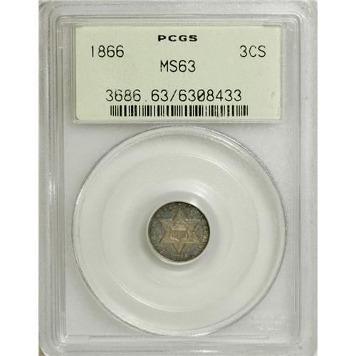1866 3CS MS63 PCGS. The 1866 three cent silver represe