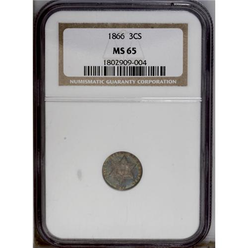 <B>1866<3CS> MS65 NGC.</B></I> Splashes of cobalt-blue, sea-green, gold, and lilac toning adhere to lustrous surfaces that display sharply struck design features. The surfaces are devoid of mentionable abrasions, but reveal fairly heavy clash marks on each side. A very attractive Gem that is sure to please. Census: 11 in 65, 13 finer (3/06). <BR><BR><B>Important notice:</B> Heritage usually auctions material at the rate of 200-250 lots per hour. On some occasions eBay Live bid software or the Internet may not be able to keep up with the pace of the auction. We recommend placing a realistic absentee bid now as insurance to avoid disappointment. Occasionally the auctioneer may eliminate or reject an eBay Live bid, and the auctioneer may also reopen a lot after the close of the eBay live bidding (usually because we missed an audience bid), and may reject your bid even if it shows you as the winning bidder. By bidding via eBay Live, you agree that Heritage may award the lot to another bidder at its sole discretion under the circumstances described above or any other reasonable circumstances. Since eBay bids are not shown to us until we open the lot on the floor, we treat those bids just like floor bids. In most cases the floor responds before the eBay bid is presented to us, due to Internet lag time, so for consistency we have made it a policy that floor bids are always considered first over tie eBay live bids. Also please note that all Heritage lots purchased through eBay Live carry a 20% Buyer's Premium. Please make sure you read the Terms and Conditions before you bid. This lot is being auctioned in conjunction with a live floor auction by Heritage Galleries & Auctioneers. All final auction and invoice information will be supplied by Heritage Galleries & Auctioneers, and all other information should be considered preliminary. Lot:766 <BR><BR><B>Winning Notification and Billing:</B> After the FINAL session in this auction is complete, Heritage will send e-mail and snail mail invoices. This process normally takes several days. All final auction and invoice information will be supplied by Heritage Galleries & Auctioneers, and all other information should be considered preliminary. <BR><BR>This auction will be conducted on a live auction floor and over the Internet through eBay Live. If you choose to place an absentee bid, please take a moment to <font color='#0000ff'><u><a href='http://pages.ebay.com/liveauctions/help/before/laabsentee.html'>learn how eBay Live absentee bidding works</a></u></font><font color='#000000'>