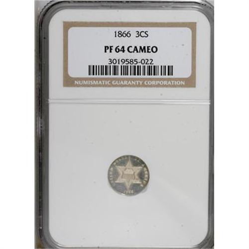 <B>1866 3CS PR64 Cameo NGC.</B></I> Despite a measure of gold-gray haze that has settled over the fields, this near-Gem offers undeniable contrast, thanks to the richly frosted devices. Sharply struck with only a handful of generally inoffensive flaws.<BR><BR><b>Shipping:</b> Coins & Currency (<a target="_blank" href="http://www.heritageauctions.com/common/shipping.php">view shipping information</a>)