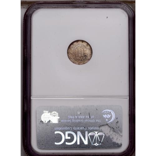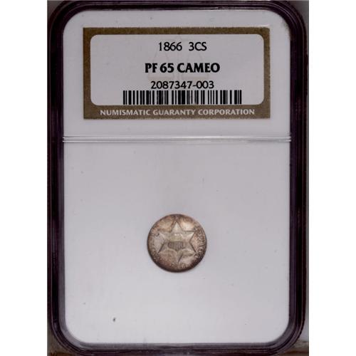 <B>1866<3CS> PR65 Cameo NGC.</B></I> Fully struck with smoky-gray toning enhanced by speckled russet and reddish-purple coloration near the periphery. The fields are noticeably reflective through the toning, and the central devices are mildly frosted. Free of handling marks, with an interesting lintmark (as struck), resembling a lasso, near the lower point of the obverse shield.
