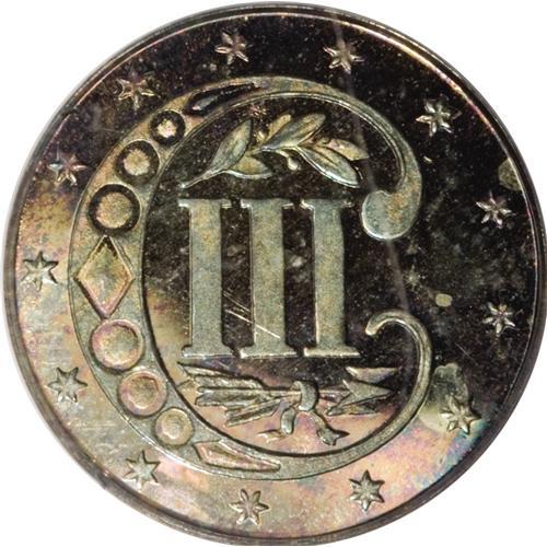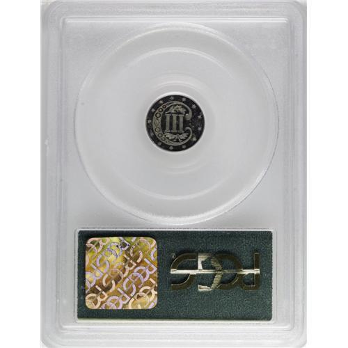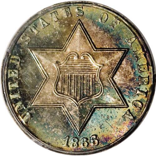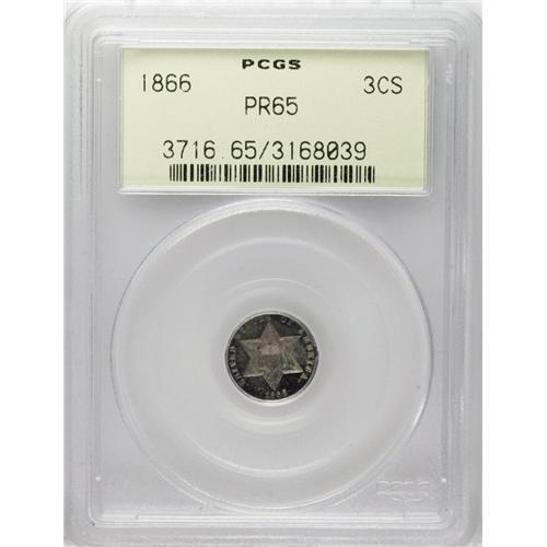 <B>1866 3CS Three Cent Silver PR65 PCGS.</B></I> Cherry-red and aquamarine toning endows this exactingly struck Gem. The fields are deeply basined and dramatically mirrored. Rare in such exemplary quality, and encapsulated in an old green label holder. Just 725 pieces were struck. Population: 26 in 65, 18 finer (10/06).<BR><BR><b>Shipping:</b> Coin/Currency (<a target="_blank" href="http://www.heritageauctions.com/common/shipping.php">view shipping information</a>)