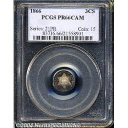 <B>1866<3CS> PR66 Cameo PCGS.</B></I> Attractive sea-green and purple toning lightens in the center to a well frosted star on the obverse, while similar turquoise and russet hues dominate the reverse. An interesting circular lintmark can be seen at the base of the shield within the six pointed star on the obverse. A scant 725 proofs were issued and few have received the Cameo designation. Population: 1 in 66 Cameo, 0 finer (4/03).<BR><I>Ex: Numismatic Enterprises Sale, lot 246 where it sold for $120.</B></I> <BR><BR><B>Important notice:</B> Heritage usually auctions material at the rate of 200-250 lots per hour. On some occasions eBay Live bid software or the Internet may not be able to keep up with the pace of the auction. We recommend placing a realistic absentee bid now as insurance to avoid disappointment. Occasionally the auctioneer may eliminate or reject an eBay Live bid, and the auctioneer may also reopen a lot after the close of the eBay live bidding (usually because we missed an audience bid), and may reject your bid even if it shows you as the winning bidder. By bidding via eBay Live, you agree that Heritage may award the lot to another bidder at its sole discretion under the circumstances described above or any other reasonable circumstances. Since eBay bids are not shown to us until we open the lot on the floor, we treat those bids just like floor bids. In most cases the floor responds before the eBay bid is presented to us, due to Internet lag time, so for consistency we have made it a policy that floor bids are always considered first over tie eBay live bids. Also please note that all Heritage lots purchased through eBay Live carry a 20% Buyer's Premium. Please make sure you read the Terms and Conditions before you bid.