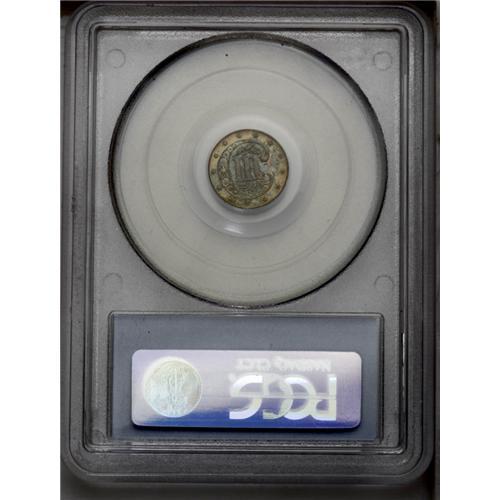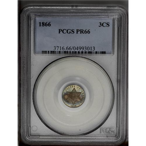 <B>1866<3CS> PR66 PCGS.</B></I> Pastel cobalt-blue and gold-tan patina enhances the cameo-like effect between the lightly frosted, well struck motifs and mirrored fields. Well preserved throughout. Population: 15 in 66, 2 finer (3/06). <BR><BR><B>Important notice:</B> Heritage usually auctions material at the rate of 200-250 lots per hour. On some occasions eBay Live bid software or the Internet may not be able to keep up with the pace of the auction. We recommend placing a realistic absentee bid now as insurance to avoid disappointment. Occasionally the auctioneer may eliminate or reject an eBay Live bid, and the auctioneer may also reopen a lot after the close of the eBay live bidding (usually because we missed an audience bid), and may reject your bid even if it shows you as the winning bidder. By bidding via eBay Live, you agree that Heritage may award the lot to another bidder at its sole discretion under the circumstances described above or any other reasonable circumstances. Since eBay bids are not shown to us until we open the lot on the floor, we treat those bids just like floor bids. In most cases the floor responds before the eBay bid is presented to us, due to Internet lag time, so for consistency we have made it a policy that floor bids are always considered first over tie eBay live bids. Also please note that all Heritage lots purchased through eBay Live carry a 20% Buyer's Premium. Please make sure you read the Terms and Conditions before you bid. This lot is being auctioned in conjunction with a live floor auction by Heritage Galleries & Auctioneers. All final auction and invoice information will be supplied by Heritage Galleries & Auctioneers, and all other information should be considered preliminary. Lot:771 <BR><BR><B>Winning Notification and Billing:</B> After the FINAL session in this auction is complete, Heritage will send e-mail and snail mail invoices. This process normally takes several days. All final auction and invoice information will be supplied by Heritage Galleries & Auctioneers, and all other information should be considered preliminary. <BR><BR>This auction will be conducted on a live auction floor and over the Internet through eBay Live. If you choose to place an absentee bid, please take a moment to <font color='#0000ff'><u><a href='http://pages.ebay.com/liveauctions/help/before/laabsentee.html'>learn how eBay Live absentee bidding works</a></u></font><font color='#000000'>