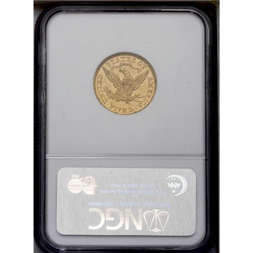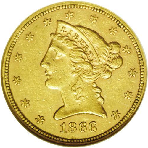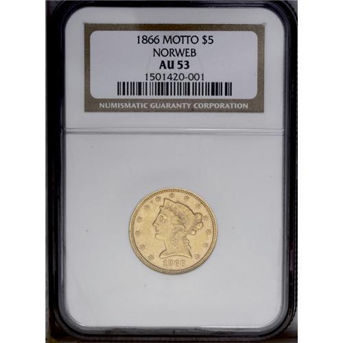 <B>1866<$5> AU53 NGC.</B></I> Ex: Norweb. The first year of the With Motto coinage, this example is from a scant mintage of 6,700 pieces. The copper-gold surfaces still emit a bit of mint luster, and a few small handling marks can be seen with a loupe. Pleasingly well struck, on a problem-free planchet.<BR><I>Ex: The Norweb Collection (Bowers and Merena, 10/87), lot 877. A flip insert from that sale is included.</B></I> <BR><BR><B>Important notice:</B> Heritage usually auctions material at the rate of 200-250 lots per hour. On some occasions eBay Live bid software or the Internet may not be able to keep up with the pace of the auction. We recommend placing a realistic absentee bid now as insurance to avoid disappointment. Occasionally the auctioneer may eliminate or reject an eBay Live bid, and the auctioneer may also reopen a lot after the close of the eBay live bidding (usually because we missed an audience bid), and may reject your bid even if it shows you as the winning bidder. By bidding via eBay Live, you agree that Heritage may award the lot to another bidder at its sole discretion under the circumstances described above or any other reasonable circumstances. Since eBay bids are not shown to us until we open the lot on the floor, we treat those bids just like floor bids. In most cases the floor responds before the eBay bid is presented to us, due to Internet lag time, so for consistency we have made it a policy that floor bids are always considered first over tie eBay live bids. Also please note that all Heritage lots purchased through eBay Live carry a 20% Buyer's Premium. Please make sure you read the Terms and Conditions before you bid. This lot is being auctioned in conjunction with a live floor auction by Heritage Galleries & Auctioneers. All final auction and invoice information will be supplied by Heritage Galleries & Auctioneers, and all other information should be considered preliminary. Lot:2763 <BR><BR><B>Winning Notification and Billing:</B> After the FINAL session in this auction is complete, Heritage will send e-mail and snail mail invoices. This process normally takes several days. All final auction and invoice information will be supplied by Heritage Galleries & Auctioneers, and all other information should be considered preliminary. <BR><BR>This auction will be conducted on a live auction floor and over the Internet through eBay Live. If you choose to place an absentee bid, please take a moment to <font color='#0000ff'><u><a href='http://pages.ebay.com/liveauctions/help/before/laabsentee.html'>learn how eBay Live absentee bidding works</a></u></font><font color='#000000'>