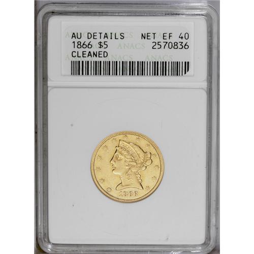 1866 $5 --Cleaned--ANACS. AU Details, Net XF40. Only 6,