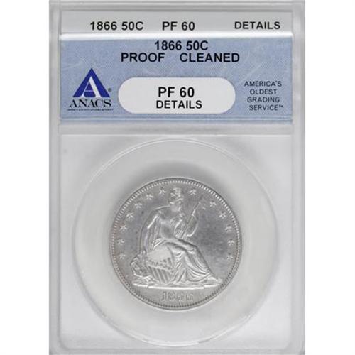 <B>1866 50C Motto--Cleaned--ANACS. PR60 Details.</B></I> NGC Census: (1/81). PCGS Population (9/129). Mintage: 725. Numismedia Wsl. Price for NGC/PCGS coin in PR60: $350. (#6424)<BR><BR><B>Coin Engraver:</B> Christian Gobrecht<BR><BR><b>Shipping:</b> Coins & Currency (<a target="_blank" href="http://www.heritageauctions.com/common/shipping.php">view shipping information</a>)