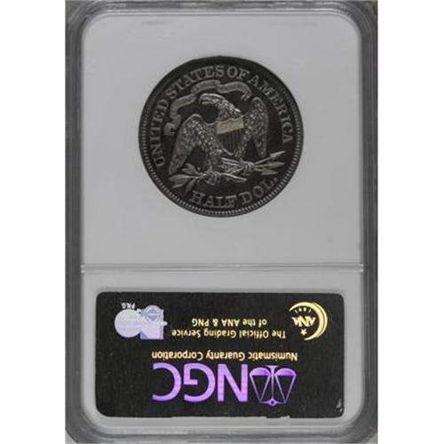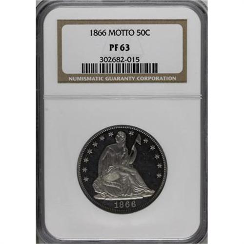 <B>1866 50C Motto PR63 NGC.</B></I> A gorgeous Select proof representative of this scarcer issue, from a low mintage of just 725 pieces. Obvious cameo contrast is noted on the obverse, and a milder cameo effect is also observed on the reverse. Census: 20 in 63, 44 finer (7/07).<BR><BR><B>Coin Engraver:</B> Christian Gobrecht<BR><BR><b>Shipping:</b> Coins & Currency (<a target="_blank" href="http://www.heritageauctions.com/common/shipping.php">view shipping information</a>)