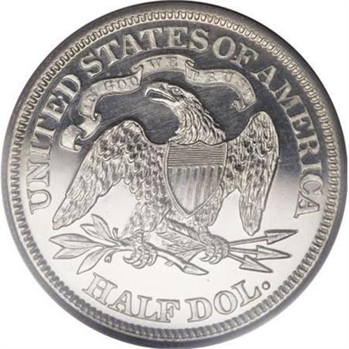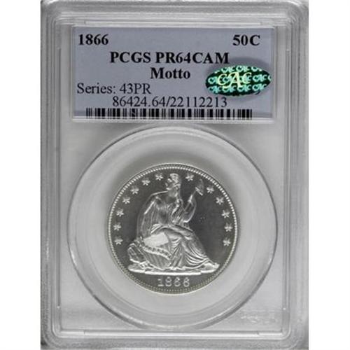 <B>1866 50C Motto PR64 Cameo PCGS. CAC.</B></I> Obvious cameo frost confirms the eye appeal of this untoned and exquisitely struck near-Gem. The final date digit was likely added in a separate step, since the 66 is widely spaced relative to the 186. A scant 725 proofs were struck. Population: 9 in 64 Cameo, 3 finer (11/07).<BR><I>From The Kallenberg #1 PCGS Registry Set Of Proof Half Dollars.</B></I><BR><BR><b>Shipping:</b> Coins & Currency (<a target="_blank" href="http://www.heritageauctions.com/common/shipping.php">view shipping information</a>)