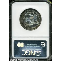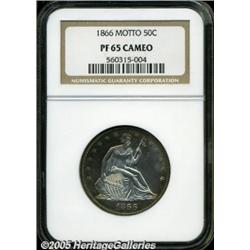 <B>1866 50C Motto PR65 Cameo NGC.</B></I> Iridescent electric-blue, honey-brown, and mauve colors bathe the borders of this exquisitely struck Gem. Heavy cameo frost provides obvious contrast with the striated and reflective fields. A scant 725 proofs were struck, not including the unique No Motto proof that was stolen at gunpoint from the duPont family in 1967. Population: 1 in 65 Cameo, 4 finer (2/05).