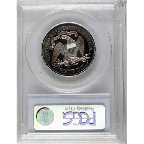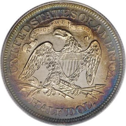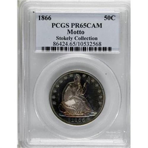 <B>1866 50C Motto PR65 Cameo PCGS.</B></I> Ex: Stokely Collection. Golden-brown, champagne-rose, and ocean-blue toning endows this intricately struck Gem. Gorgeously smooth fields and icy devices combine for exemplary eye appeal. Any collector would be proud to display such a colorful and high quality specimen. The first Motto issue, and scarce due to a mintage of just 725 proofs. PCGS has certified just 15 pieces as Cameo. Population: 1 in 65 Cameo, 1 finer (5/07).<BR><I>Ex: Stephen Stokely #1 PCGS Registry Set of Proof Seated Half Dollars (Heritage, 8/06), lot 3375, which realized $9,775.</B></I><BR><BR><b>Shipping:</b> Coins & Currency (<a target="_blank" href="http://www.heritageauctions.com/common/shipping.php">view shipping information</a>)