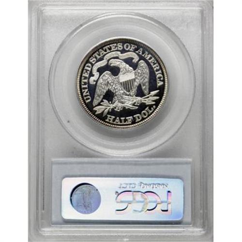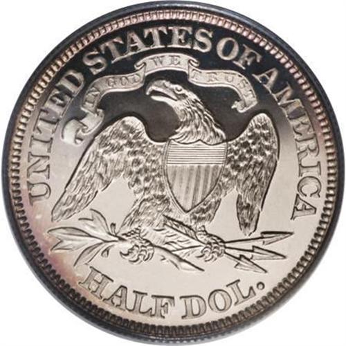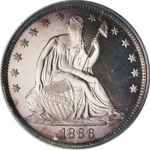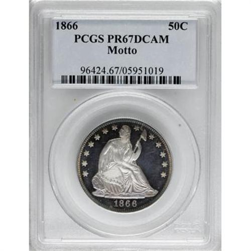 1866 50C Motto PR67 Deep Cameo PCGS. After IN GOD WE TRUST made its first appearance on circulating coinage in 1864, the push to include the motto on other, larger denominations continued. In 1866, the Mint incorporated IN GOD WE TRUST into the designs for seven denominations, the new five cent nickel, the three largest in silver, and the three largest in gold. On the quarter, half dollar, and silver dollar, the motto appears on a ribbon or scroll just above the eagle's head, a position echoed in the revised half eagle and eagle reverses. Both literally and figuratively, the motto is "well placed," as the design modification has provided a convenient dividing line for collectors of Seated halves, splitting the design's tenure of more than half a century into two more easily collectible series of roughly 25 years each.<BR> This is an exquisite first-year specimen that makes even the most seasoned numismatist take notice, a one-of-a-kind beauty. In the PCGS <I>Population Report</B></I>, it is the only<I> </B></I>Superb Gem proof 1866 Motto half, the only Deep Cameo example for the issue, and one of just four Deep Cameo Superb Gems for the series, all of them of the With Motto variety (6/07). <BR> Just as important as its technical preservation is the coin's undeniable visual appeal. Its carefully preserved surfaces are immaculate to the unaided eye. The fields shine beautifully through a thin veil of blue-green and violet patina with small pockets of gold-orange color at the rims, while the richly frosted, needle-sharp devices remain silver-white. Memorable proof Seated halves offered by Heritage, coins such as the 1867 NGC PR67 Ultra Cameo piece sold for $40,250 at the 2007 National Money Show and the 1867 PCGS PR66 Deep Cameo example from the 2005 FUN Auction which realized $35,650, set the high-water mark for the series, and this outstanding 1866 Motto piece easily ranks alongside them.<BR><BR><b>Shipping:</b> Coins & Currency (<a target="_blank" href="http://www.heritageauctions.com/common/shipping.php">view shipping information</a>)
