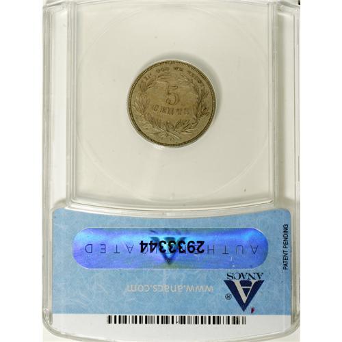 <B>1866 5C Five Cents, Judd-461, Pollock-535, R.5, AU58 ANACS.</B></I> A bust of George Washington faces right on the obverse, the legend surrounds him, and the date is below. The reverse features the denomination 5 CENTS within a laurel wreath with IN GOD WE TRUST above. Struck in nickel with a plain edge. The base of an errant 1 is located west of the date. Washington's eye appears to be die doubled. This is a well struck olive-gray example with an area of faint granularity (as struck) noted on Washington's neck. Small dark specks are seen mostly near the reverse periphery.<BR><I>From The Dale A. Konigsburg Collection, Part Two.</B></I><BR><BR><b>Shipping:</b> Coins & Currency (<a target="_blank" href="http://www.heritageauctions.com/common/shipping.php">view shipping information</a>)