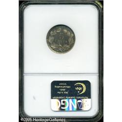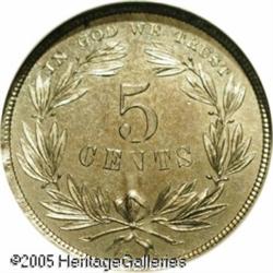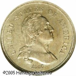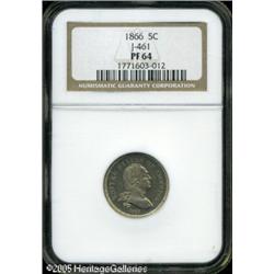 <B>1866 5C Five Cents, Judd-461, Pollock-535, R.5, PR64 NGC.</B></I> A bust of George Washington faces right on the obverse, the legend surrounds him, and the date is below. The reverse features the denomination 5 CENTS within a laurel wreath with IN GOD WE TRUST above. Struck in nickel with a plain edge. The base of an errant 1 is located west of the date. Washington's eye appears to be die doubled. An boldly struck golden-gray example with a few areas of granularity noted on each side. Population: 5 in 64, 3 finer (1/05). Lot:9839
