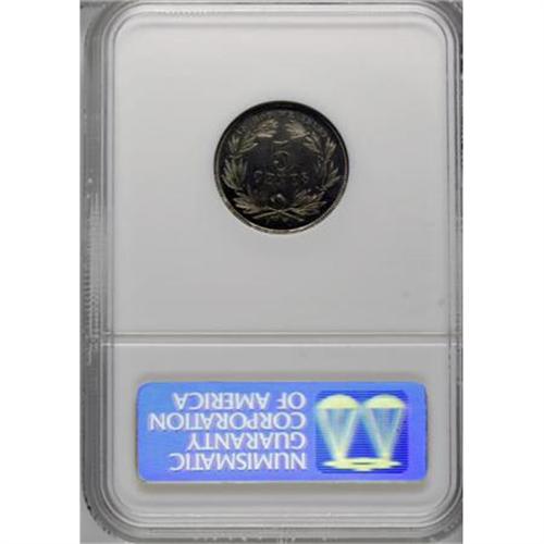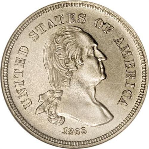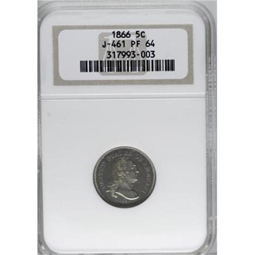 <B>1866 5C Five Cents, Judd-461, Pollock-535, R.5, PR64 NGC.</B></I> A bust of George Washington faces right on the obverse, UNITED STATES OF AMERICA surrounds, and the date is below. The reverse features the denomination 5 CENTS within a laurel wreath with IN GOD WE TRUST above. Struck in nickel with a plain edge. Possibly three dozen pieces are known in nickel. This piece has light, speckled rose and blue toning over each side with good underlying reflectivity.<BR><BR><b>Shipping:</b> Coins & Currency (<a target="_blank" href="http://www.heritageauctions.com/common/shipping.php">view shipping information</a>)