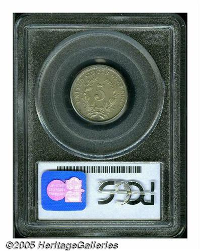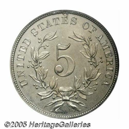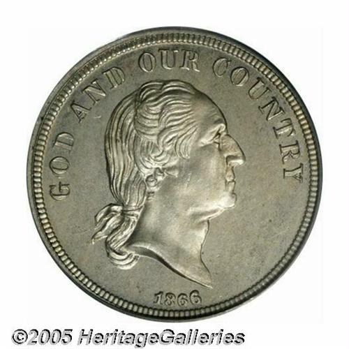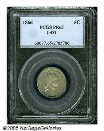 <B>1866<5C> Five Cents, Judd-481, Pollock-571, Low R.7, PR65 PCGS.</B></I> Five-cent pattern with the head of Washington facing right and the motto GOD AND OUR COUNTRY in the upper peripheral margin. The reverse has a fancy numeral 5 in the center that is surrounded by a laurel wreath and UNITED STATES OF AMERICA at the margin. Struck in nickel with a plain edge. Both sides of this nearly spot-free representative are cloaked in battleship-gray patina.<BR><I>From The Western Hills Collection.</B></I>
