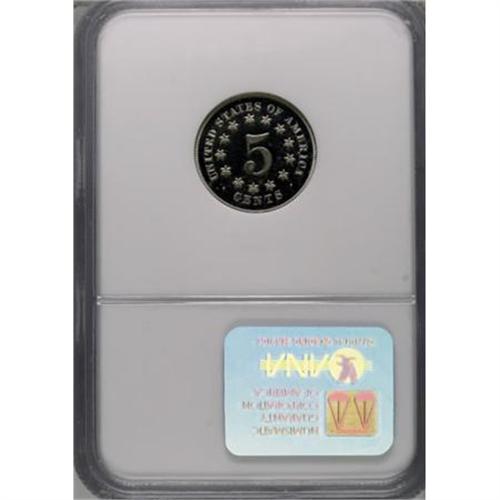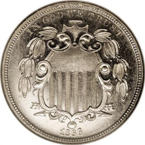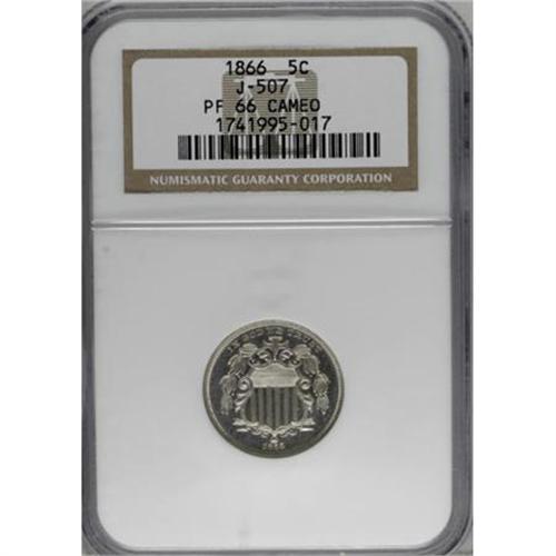 <B>1866 5C No Rays Shield Nickel, Judd-507, Pollock-591, R.7, PR66 Cameo NGC.</B></I> The Judd-507 is a highly important transitional pattern that was struck later than the 1866 date. The obverse bears the regular Shield nickel design, while the reverse has the regular Without Rays design as adopted in 1867. Struck in nickel with a plain edge. www.uspatterns.com states that the reverse is believed to be the first No Rays die, distinguished by the stars above CENTS pointing between the E and N and between the T and S. All other No Rays reverse dies have the stars pointing to the E and T.<BR> This piece offers considerable field-device contrast, with untroubled and untoned nickel-gray surfaces. The second 6 in the date is noticeably larger, perhaps 50%, than the first.<BR> <BR><BR><BR><b>Shipping:</b> Coins & Currency (<a target="_blank" href="http://www.heritageauctions.com/common/shipping.php">view shipping information</a>)