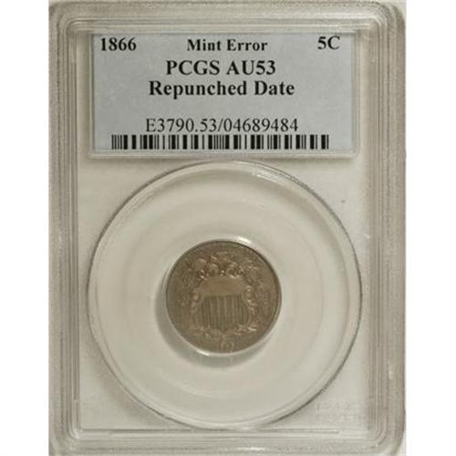 1866 5C Rays AU53 PCGS. Repunched Date. PCGS Popul
