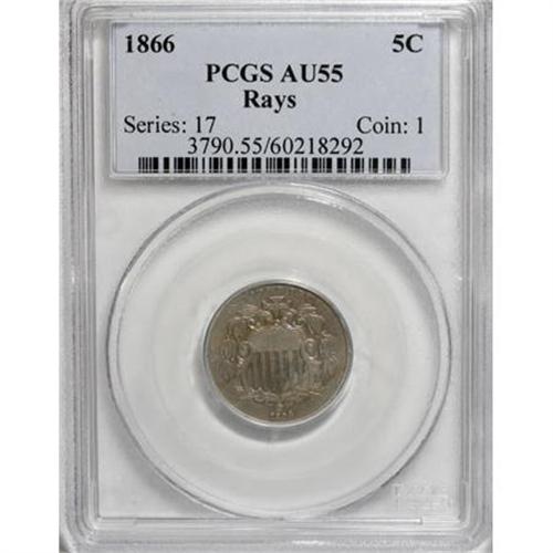 <B>1866 5C Rays AU55 PCGS.</B></I> PCGS Population (52/1117). NGC Census: (33/1154). Mintage: 14,742,500. Numismedia Wsl. Price for NGC/PCGS coin in AU55: $195. (#3790)<BR><BR><B>Coin Engraver:</B> James B. Longacre<BR><BR><b>Shipping:</b> Coins & Currency (<a target="_blank" href="http://www.heritageauctions.com/common/shipping.php">view shipping information</a>)