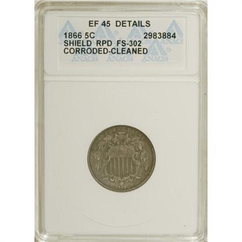 <B>1866 5C Rays--Cleaned, Corroded, Repunched Date--ANACS. XF45 Details.</B></I> FS-302. NGC Census: (8/1183). PCGS Population (18/1178). Mintage: 14,742,500. Numismedia Wsl. Price for NGC/PCGS coin in XF45: $135. (#3790)<BR><BR><b>Shipping:</b> Coins & Currency (<a target="_blank" href="http://www.heritageauctions.com/common/shipping.php">view shipping information</a>)