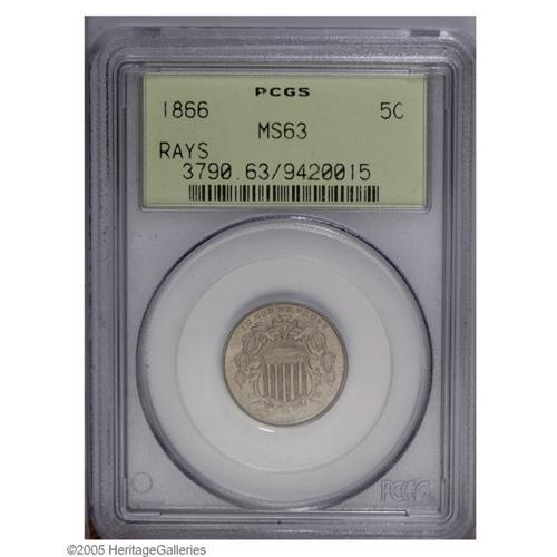 <B>1866<5C> Rays MS63 PCGS.</B></I> A must have for the type aficionado, this nickel is minimally abraded for the grade with noticeable doubling of several digits in the date. Some weakness around the margin lend reason for why a higher grade was not awarded. Housed in an older PCGS holder.