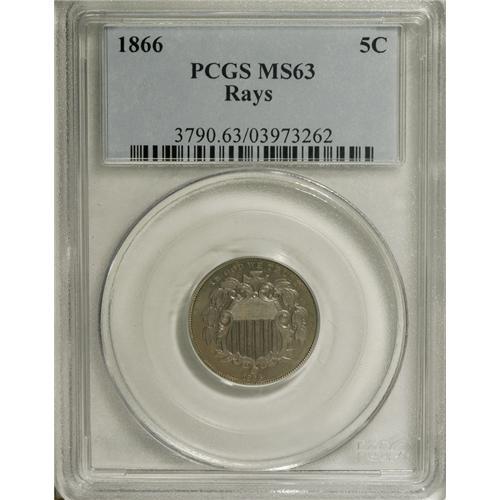 <B>1866 5C Rays MS63 PCGS.</B></I> PCGS Population (306/538). NGC Census: (235/673). Mintage: 14,742,500. Numismedia Wsl. Price: $320. (#3790)<BR><BR><b>Shipping:</b> Coins & Currency (<a target="_blank" href="http://www.heritageauctions.com/common/shipping.php">view shipping information</a>)