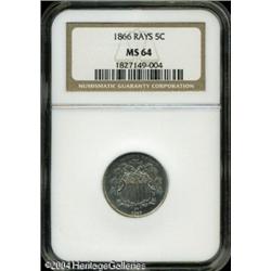 1866 5C Rays MS64 NGC. A lustrous and beautifully <B>1866 5C Rays MS64 NGC.</B></I> A lustrous and beautifully preserved first year Shield Nickel that offers wisps of tan patina. This piece would surely grade higher were it not for an indifferent strike across portions of the left margins. <BR><BR><B>Important notice:</B> Heritage usually auctions material at the rate of 200-250 lots per hour. On some occasions eBay Live bid software or the Internet may not be able to keep up with the pace of the auction. We recommend placing a realistic absentee bid now as insurance to avoid disappointment. Occasionally the auctioneer may eliminate or reject an eBay Live bid, and the auctioneer may also reopen a lot after the close of the eBay live bidding (usually because we missed an audience bid), and may reject your bid even if it shows you as the winning bidder. By bidding via eBay Live, you agree that Heritage may award the lot to another bidder at its sole discretion under the circumstances described above or any other reasonable circumstances. Since eBay bids are not shown to us until we open the lot on the floor, we treat those bids just like floor bids. In most cases the floor responds before the eBay bid is presented to us, due to Internet lag time, so for consistency we have made it a policy that floor bids are always considered first over tie eBay live bids. Also please note that all Heritage lots purchased through eBay Live carry a 20% Buyer's Premium. Please make sure you read the Terms and Conditions before you bid. This lot is being auctioned in conjunction with a live floor auction by Heritage Galleries & Auctioneers. All final auction and invoice information will be supplied by Heritage Galleries & Auctioneers, and all other information should be considered preliminary. Lot:5504