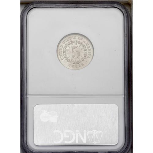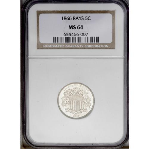 <B>1866<5C> Rays MS64 NGC.</B></I> Speckles of milky-gray color adhere to lustrous surfaces, and the design elements exhibit an even, sharp strike. A couple of unobtrusive marks prevent a higher grade. Overall, quite a sharp near-Gem. Some typically seen die cracks are visible on the reverse.