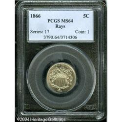 1866 5C Rays MS64 PCGS. Bright nickel-gray surface <B>1866 5C Rays MS64 PCGS.</B></I> Bright nickel-gray surfaces reveal just a few grade-defining contact marks. The design features are well struck up. <BR><BR><B>Important notice:</B> Heritage usually auctions material at the rate of 200-250 lots per hour. On some occasions eBay Live bid software or the Internet may not be able to keep up with the pace of the auction. We recommend placing a realistic absentee bid now as insurance to avoid disappointment. Occasionally the auctioneer may eliminate or reject an eBay Live bid, and the auctioneer may also reopen a lot after the close of the eBay live bidding (usually because we missed an audience bid), and may reject your bid even if it shows you as the winning bidder. By bidding via eBay Live, you agree that Heritage may award the lot to another bidder at its sole discretion under the circumstances described above or any other reasonable circumstances. Since eBay bids are not shown to us until we open the lot on the floor, we treat those bids just like floor bids. In most cases the floor responds before the eBay bid is presented to us, due to Internet lag time, so for consistency we have made it a policy that floor bids are always considered first over tie eBay live bids. Also please note that all Heritage lots purchased through eBay Live carry a 20% Buyer's Premium. Please make sure you read the Terms and Conditions before you bid. This lot is being auctioned in conjunction with a live floor auction by Heritage Galleries & Auctioneers. All final auction and invoice information will be supplied by Heritage Galleries & Auctioneers, and all other information should be considered preliminary. Lot:5506