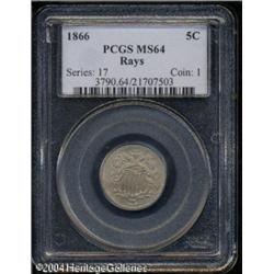 1866 5C Rays MS64 PCGS. Light gray patina visits r <B>1866 5C Rays MS64 PCGS.</B></I> Light gray patina visits relatively mark-free surfaces. The design elements are well struck, except that a couple of star centers are weak. <BR><BR><B>Important notice:</B> Heritage usually auctions material at the rate of 200-250 lots per hour. On some occasions eBay Live bid software or the Internet may not be able to keep up with the pace of the auction. We recommend placing a realistic absentee bid now as insurance to avoid disappointment. Occasionally the auctioneer may eliminate or reject an eBay Live bid, and the auctioneer may also reopen a lot after the close of the eBay live bidding (usually because we missed an audience bid), and may reject your bid even if it shows you as the winning bidder. By bidding via eBay Live, you agree that Heritage may award the lot to another bidder at its sole discretion under the circumstances described above or any other reasonable circumstances. Since eBay bids are not shown to us until we open the lot on the floor, we treat those bids just like floor bids. In most cases the floor responds before the eBay bid is presented to us, due to Internet lag time, so for consistency we have made it a policy that floor bids are always considered first over tie eBay live bids. Also please note that all Heritage lots purchased through eBay Live carry a 20% Buyer's Premium. Please make sure you read the Terms and Conditions before you bid. This lot is being auctioned in conjunction with a live floor auction by Heritage Galleries & Auctioneers. All final auction and invoice information will be supplied by Heritage Galleries & Auctioneers, and all other information should be considered preliminary. Lot:5505
