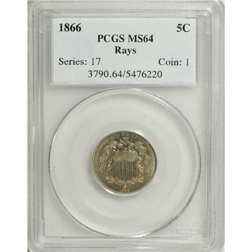 <B>1866 5C Rays MS64 PCGS.</B></I> This frosty-near Gem has highly lustrous surfaces with attractive gray-gold toning. The central obverse and reverse are lightly defined as usual.<BR><BR><b>Shipping:</b> Coins & Currency (<a target="_blank" href="http://www.heritageauctions.com/common/shipping.php">view shipping information</a>)