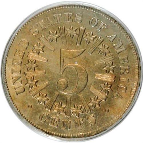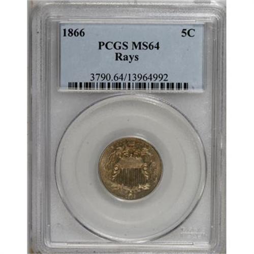 <B>1866 5C Rays MS64 PCGS.</B></I> PCGS Population (387/157). NGC Census: (485/178). Mintage: 14,742,500. Numismedia Wsl. Price for NGC/PCGS coin in MS64: $600. (#3790)<BR><BR><B>Coin Engraver:</B> James B. Longacre<BR><BR><b>Shipping:</b> Coins & Currency (<a target="_blank" href="http://www.heritageauctions.com/common/shipping.php">view shipping information</a>)