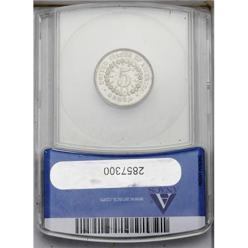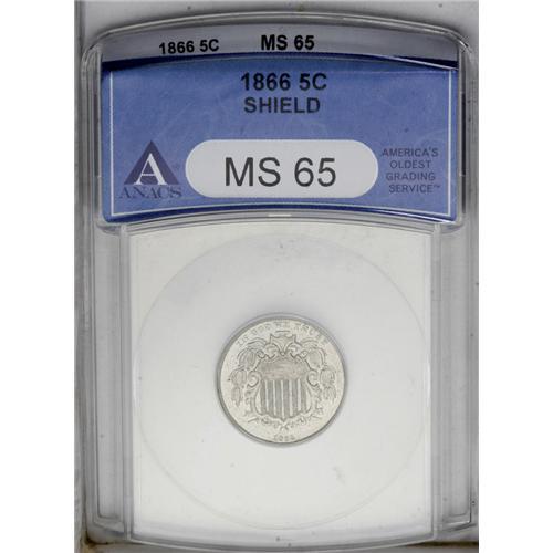 <B>1866<5C> Rays MS65 ANACS.</B></I> Although some patterns were struck in 1865, this date is the first of the series actually produced for circulation, and it is in extreme demand as such. It is a light gray Gem with a few black freckles on each side. The tops of the 66 are a bit weak, but most other design details are sharply defined.