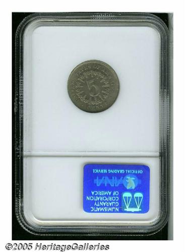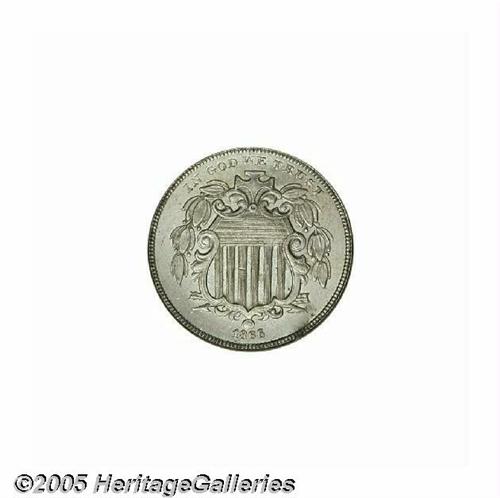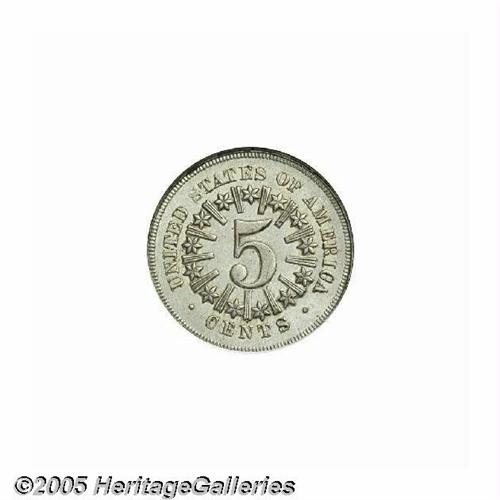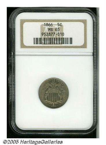 <B>1866<5C> Rays MS65 NGC.</B></I> A bright, lustrous example of this always-popular first year of type. The striking details are remarkably strong for an 1866, with the only noticeable softness being on the horizontal shield lines. The surfaces are a light nickel-gray, with just a hint of ice-blue patina which is joined by faint beige color on the reverse. A couple of minute marks on the shield are mentioned for accuracy. Population: 136 in 65, 16 finer (6/05).