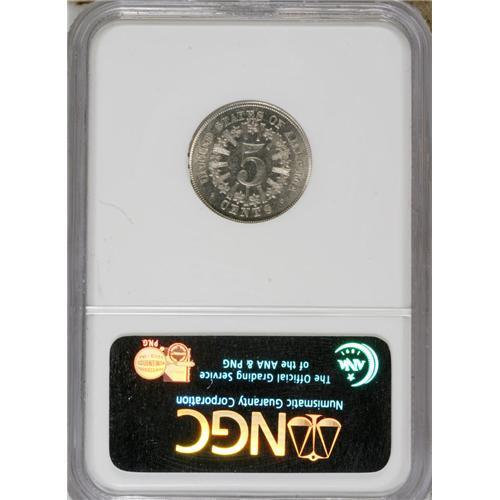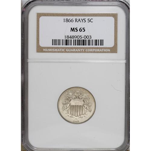 <B>1866 5C Rays MS65 NGC.</B></I> Both sides are untoned and claim highly lustrous surfaces and sharply defined design features. Some minor unobtrusive reverse hairlines are interspersed among die polish lines.<BR><BR><b>Shipping:</b> Coins & Currency (<a target="_blank" href="http://www.heritageauctions.com/common/shipping.php">view shipping information</a>)