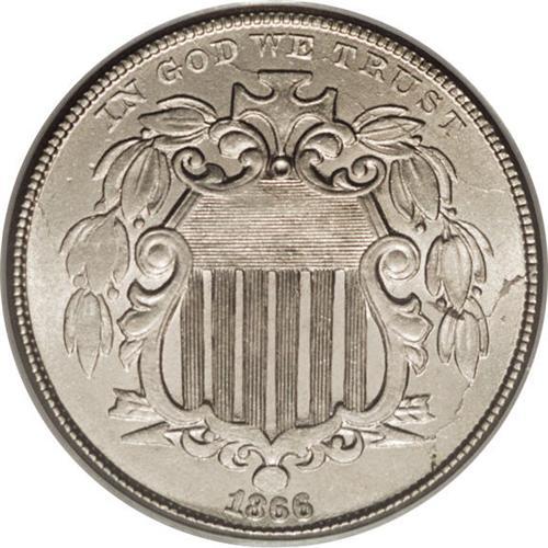 <B>1866 5C Rays MS65 PCGS.</B></I> An attractive piece, highly lustrous beneath soft blue and greenish-gold patina, that would fit well in a high-grade type set. The Mint's comparative unfamiliarity with copper-nickel as an alloy is evident on the obverse, which has several die cracks (a reflection of the wear and tear the compound inflicted on dies) and soft detail at the left obverse leaves.<BR><BR><b>Shipping:</b> Coin/Currency (<a target="_blank" href="http://www.heritageauctions.com/common/shipping.php">view shipping information</a>)