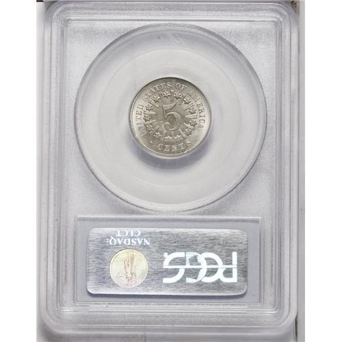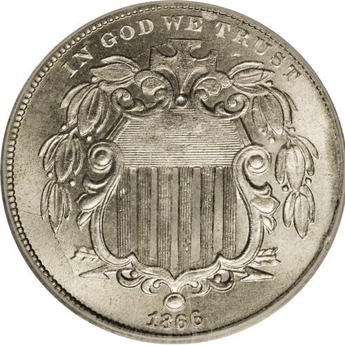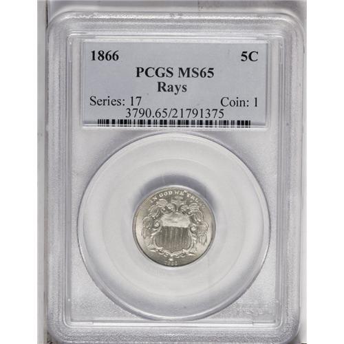 <B>1866<5C> Rays MS65 PCGS.</B></I> In spite of a generous mintage in excess of 14 million pieces and a high number of survivors (PCGS reports that 112 pieces have been certified as MS65), the 1866 remains a popular and essential first-year type for collectors. This is a lustrous example that shows no mentionable post-striking impairments. That being said, this coin does display the three problems the Mint encountered when it first attempted to strike a large-sized nickel coin: irregularity of strike, die cracks, and several planchet flaws. These problems were largely alleviated in subsequent years, but they are almost unavoidable on 1866 coins.<BR><I>From The Troy Wiseman Collection.</B></I>