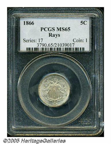 <B>1866<5C> Rays MS65 PCGS.</B></I> RPD, F-21. Boldly struck, if slightly weak on some of the reverse stars and letters, with untoned dove-gray surfaces that display satin luster, extensive die cracks (as struck) near the peripheries, and unmarked, well preserved surfaces on each side. Population: 109 in 65, 24 finer (4/05).